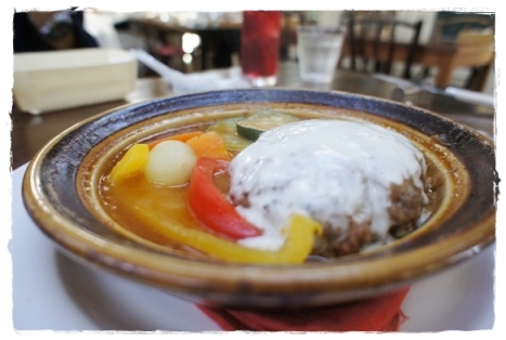 タジン鍋で作られたハンバーグ。モッツアレラチーズがのっています。
