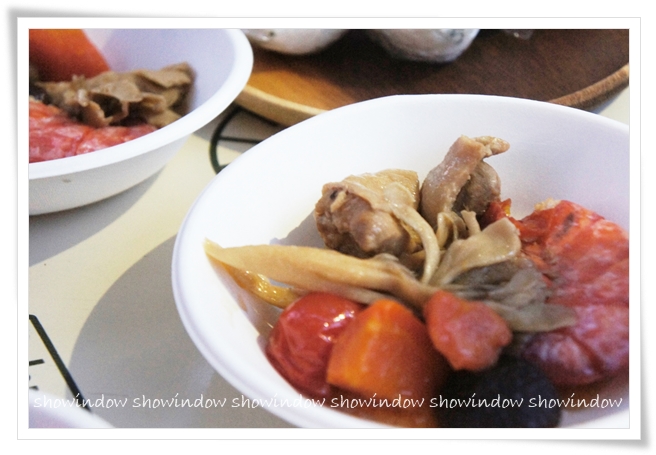 そして、豪華なエビとホロホロのモモ肉、トマトにマイタケ、しいたけ、にんじんが入った、