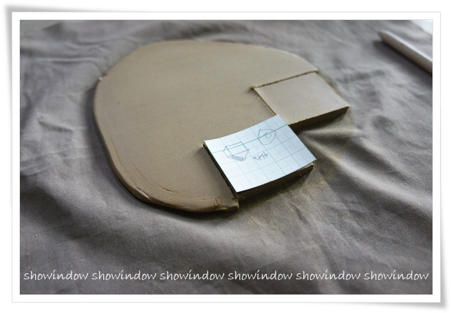 ここに、屋根の型紙を当てて、土を切っていきます。どうやったらきちんと必要な数を取れるか、考えながら切ります。